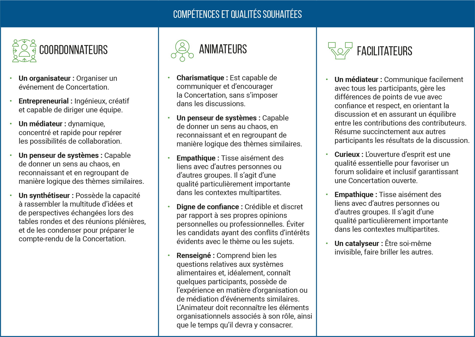 Chaque rôle s’accompagne d’un ensemble de responsabilités qui englobent une série de tâches précises. La description de ces rôles reflète l’expérience acquise dans l’organisation des Concertations sur les systèmes alimentaires dans différents contextes. Dans la pratique, les Concertations peuvent être organisées différemment, par exemple en combinant ou en répartissant les responsabilités et les tâches. Toutefois, il est conseillé de ne pas négliger ou omettre de responsabilités ou de tâches, afin de s’assurer que les participants tirent le plus grand parti de chaque Concertation.